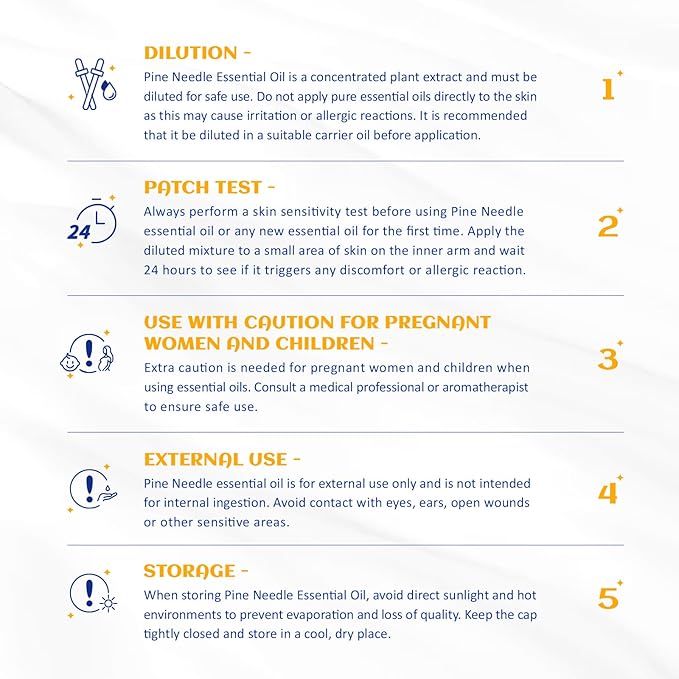 - Multiple Blend: The woodsy scent of winter pine oil essential blends well with various essential oils such as sweet orange, eucalyptus and clary sage. Dilute with carrier oil before use. Test on feet first for skin sensitivity prior to widespread use