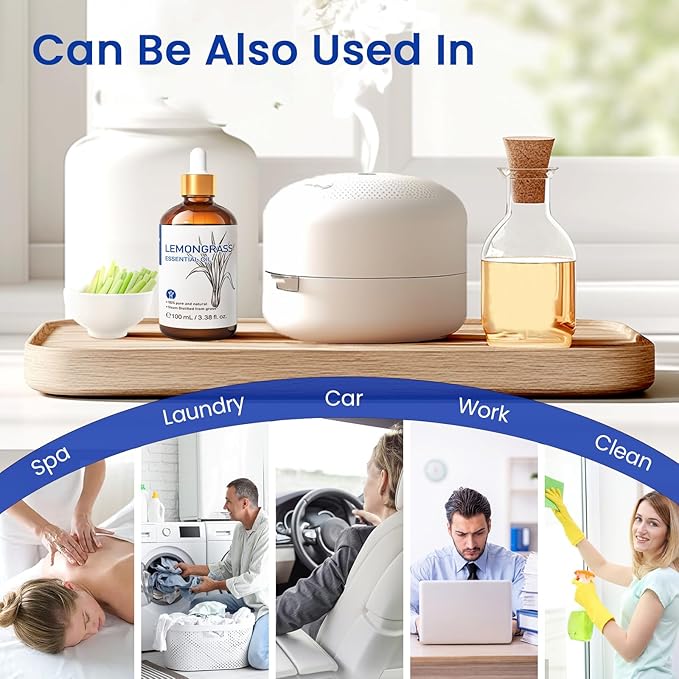 - Multiple Usage Scenarios:Add 1-2 drops of lemongrass essential oil to your office diffuser to improve concentration and clarity of thought, help with focus and productivity, commonly used in air freshening, misting, home cleaning, kitchen, shower, bathtub, toilet, sauna, spa treatments, aromatherapy, outdoor spaces, cars, bedrooms, yoga.