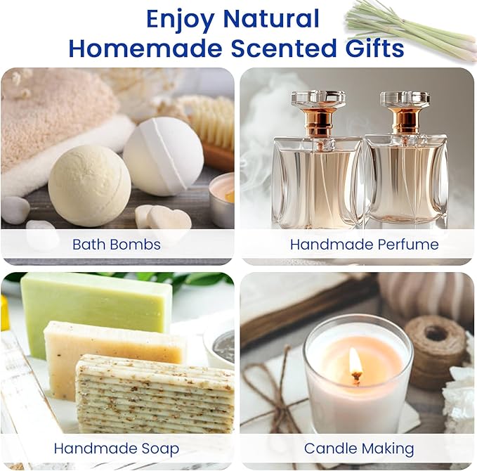- DIY: Add lemongrass to conditioners, shampoos, massage oils, body lotions, diffusers, cleansers, sprays, laundry detergents, cleansers, creams, bath salts. Also DIY perfumes, candles, soaps, bath bombs