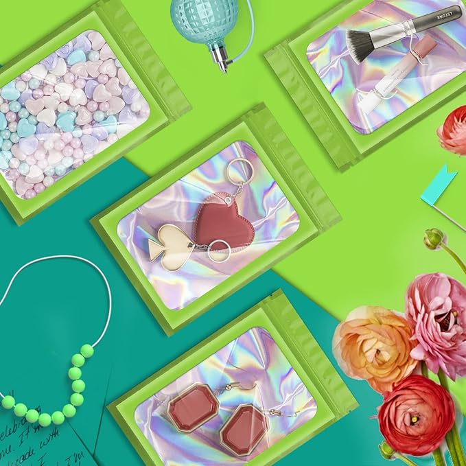 100 Pack Holographic Bags,Smell Proof Packaging Bags, Clear Window Resealable Odor Foil Pouch Mylar Bags for Food Storage and Lipgloss, Jewelry Lash(Green, 2.4 x 3.9 Inch)