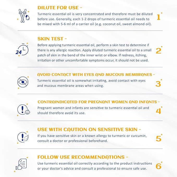 - Multiple Blend: The woodsy scent of turmeric essential oil blends well with Cinnamon, Ginger, Cardamom, Orange, Grapefruit, Ylang Ylang. Dilute with carrier oil before use. Test on feet first for skin sensitivity prior to widespread use