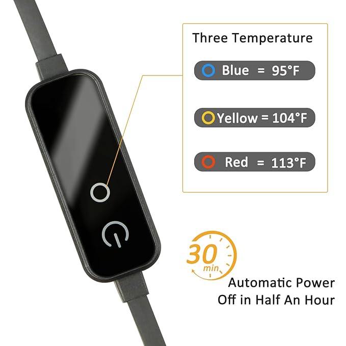 - Three levels of the temperature: The temperature lights will appear on the controller once you turn it on. Green light for Low temperature (95โ), Blue light for medium temperature (104โ), and Red light for High temperature (113โ). Also, our heated eye mask has a protection system that will automatically turn off after half an hour.