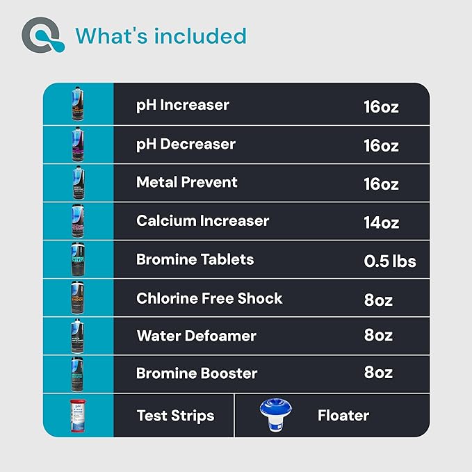 - CUSTOMIZED FOR INFLATABLE TUBS: Includes Bromine Tablets, Bromine Booster, pH Increaser, pH Decreaser, Calcium Hardness Increaser, Chlorine-free Shock, Metal Prevent, Defoamer, Water Test Strips, and a Floaterโeverything your inflatable spa needs.