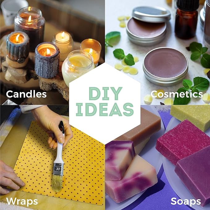 - π[Versatile Usage] Beewax has a wide range of uses, including being used as a natural food preservative as food grade beeswax, and as a primary ingredient in beewax candle making due to its clean-burning properties, projects such as making body butters, lip balms, face lotions, beeswax wraps, candles, furniture polish, soap making, crayons and so much more.