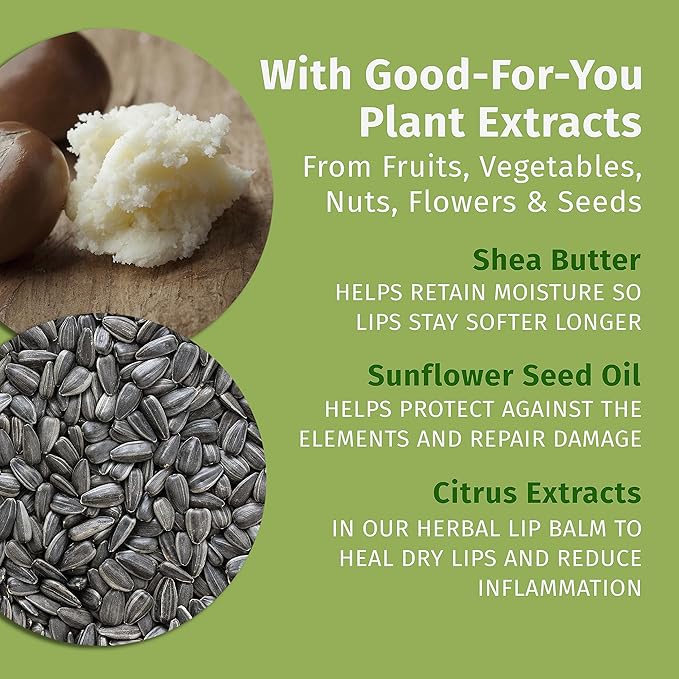 - Goodbye Cracked LIps: Moisturizes and softens with shea butter. Helps soothe and soften with vitamin-rich sunflower seed oil