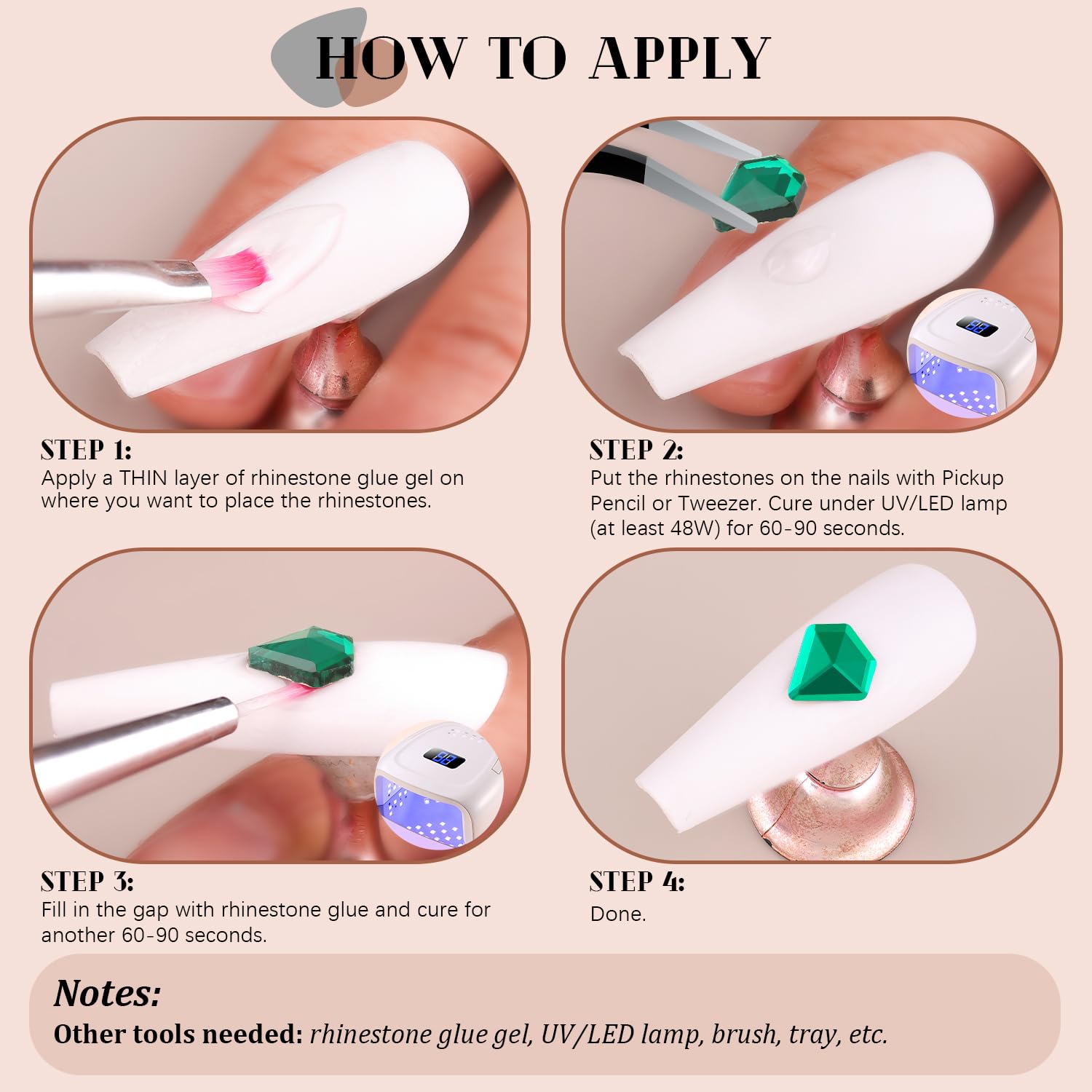 - πEASY TO USE -- Easy to apply on artificial nails. After applying nail polish and applying enough gel on the nails, simply use the equipped tools (pickup pen + tweezers) to pick up the crystals onto your nails to create your fabulous DIY designs! These crystals gemstones are different from those hotfix stones, they are not self-adhesive, you have to apply glue to stick them (glue is not included.)