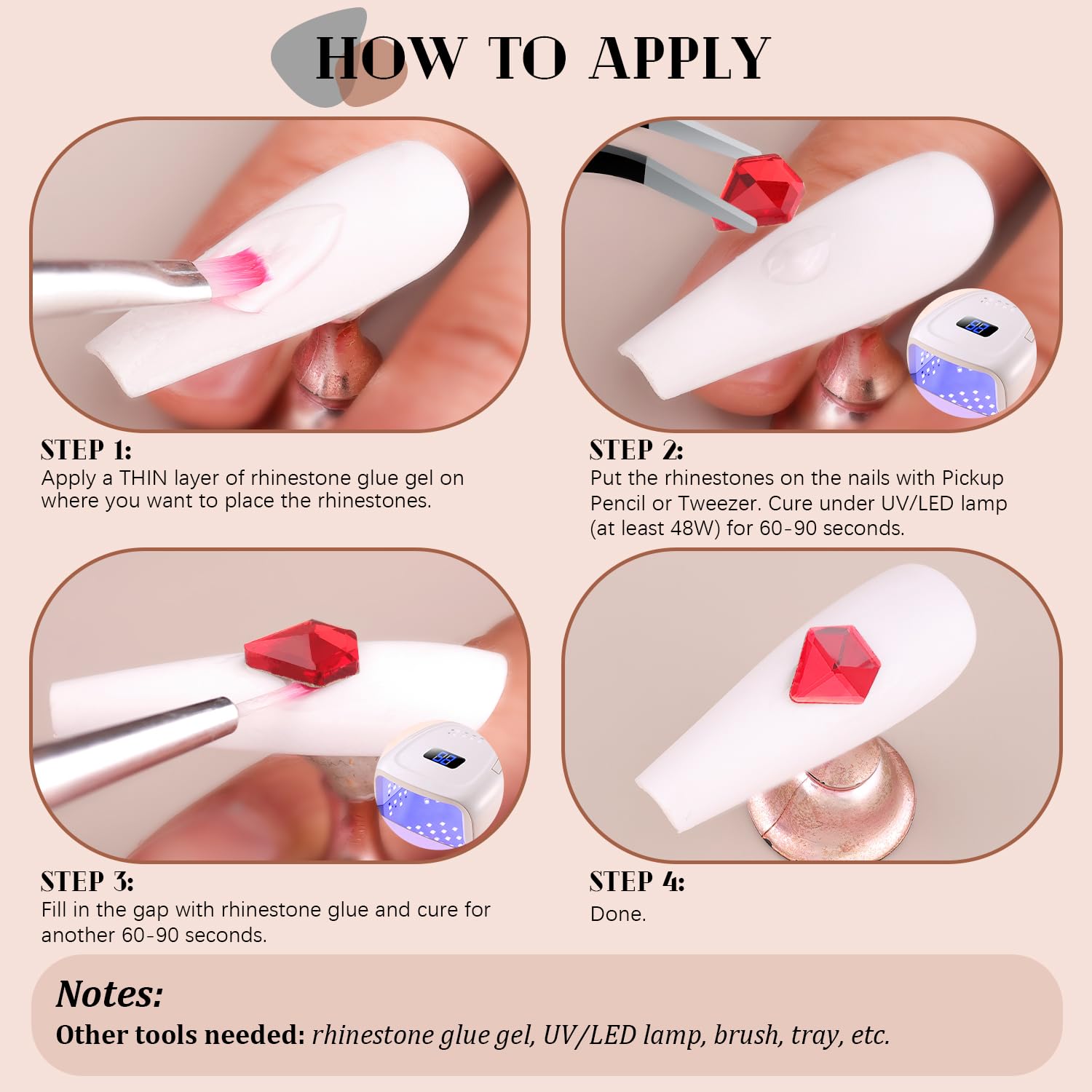 - πEASY TO USE -- Easy to apply on artificial nails. After applying nail polish and applying enough gel on the nails, simply use the equipped tools (pickup pen + tweezers) to pick up the crystals onto your nails to create your fabulous DIY designs! These crystals gemstones are different from those hotfix stones, they are not self-adhesive, you have to apply glue to stick them (glue is not included.)