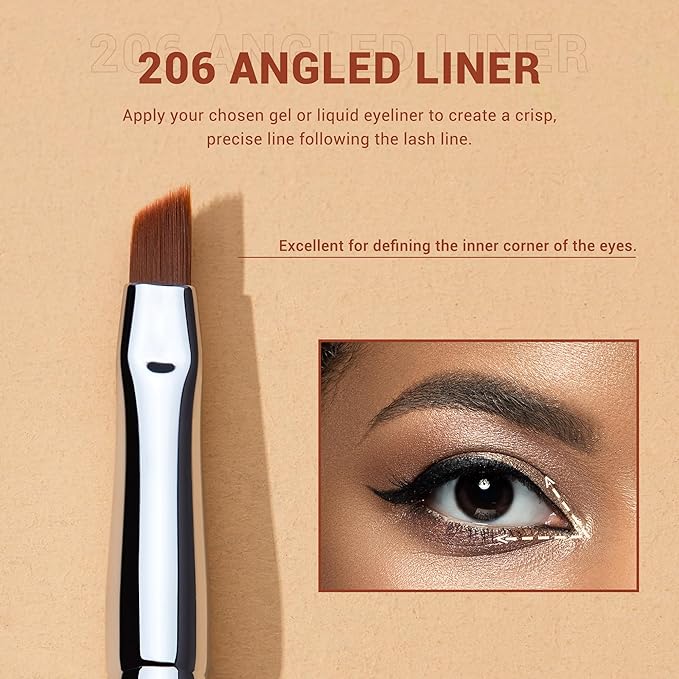 - 206 Angled Eyeliner Brush: Apply your chosen gel or liquid eyeliner to create a crisp, Precise line following the lash line. Excellent for defining the inner corner of the eyes.