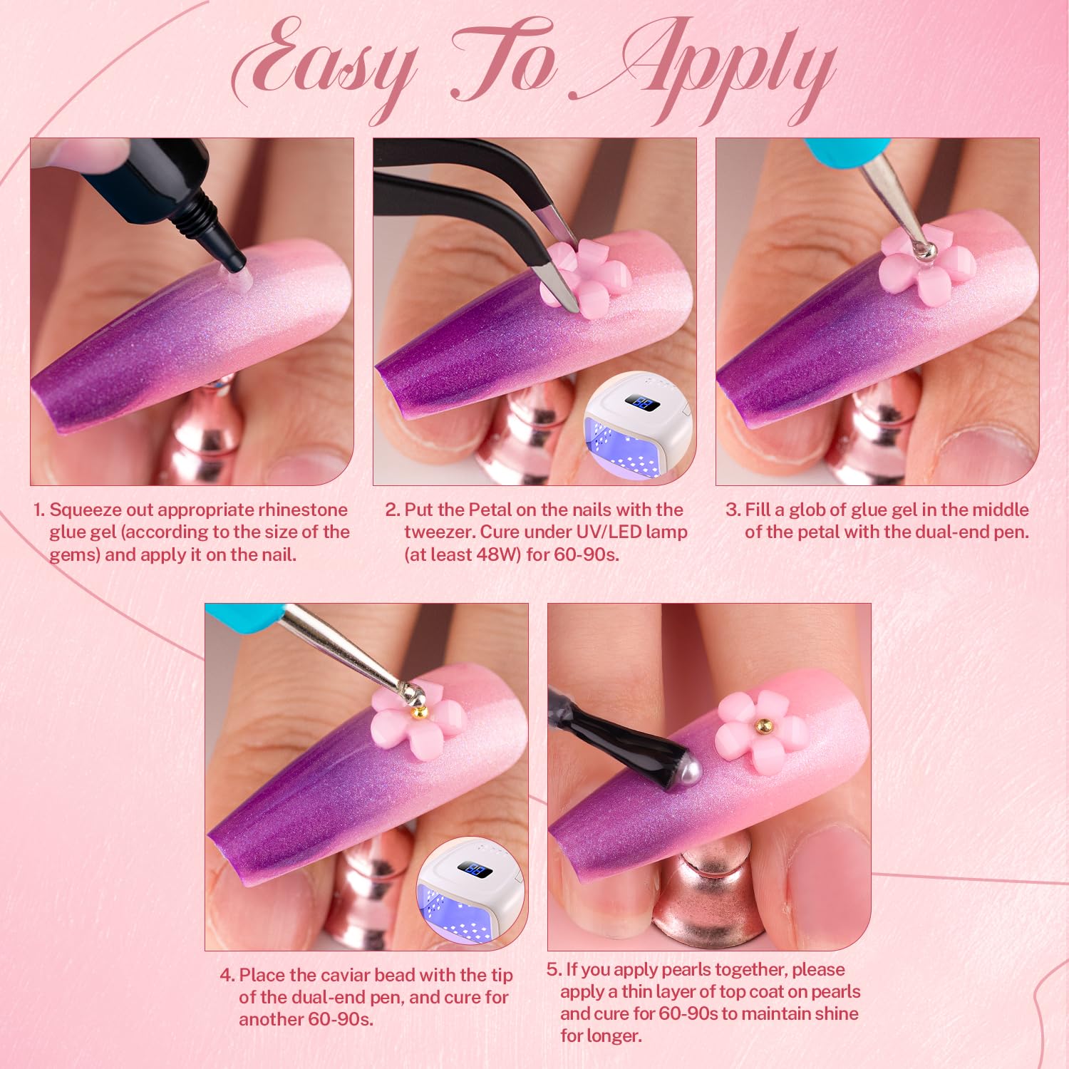 - โฟ Shining Nail Rhinestones Kit -- The 2-4mm nail rhinestones, and ABS pearls are wildcard to add glitz to most of your stylish nail designs. Besides, the pickup pen and tweezers will be a good helper for applying your big and small embellishments.