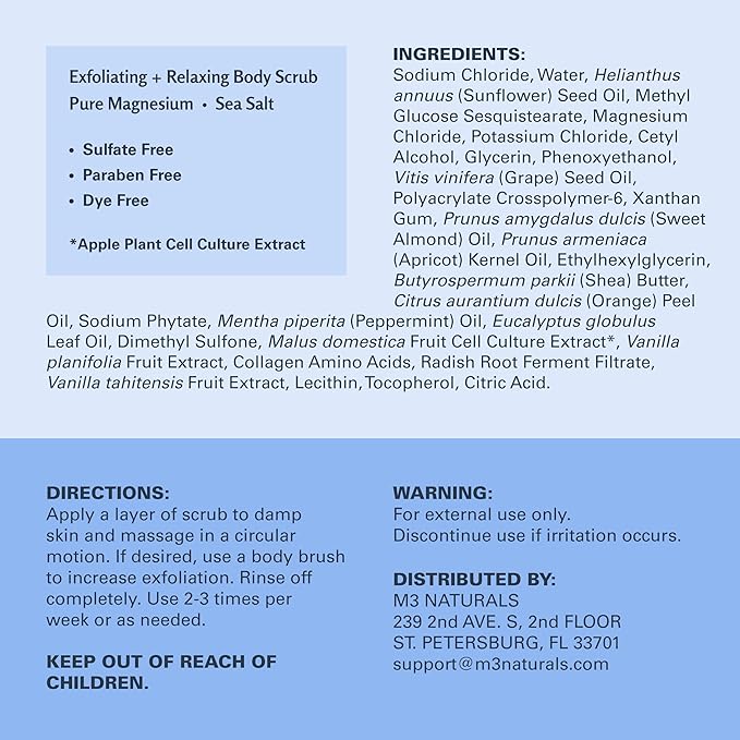 - Skin-Loving Ingredients from Nature: Made with only the finest ingredients for all skin types, M3's Magnesium Bath Scrub has been rigorously examined to keep out unnecessary harsh additivesβusing only what your skin will love. Made in USA with domestic and globally sourced ingredients. M3 Naturals is a brand that contains products that contain natural ingredients and other ingredients.