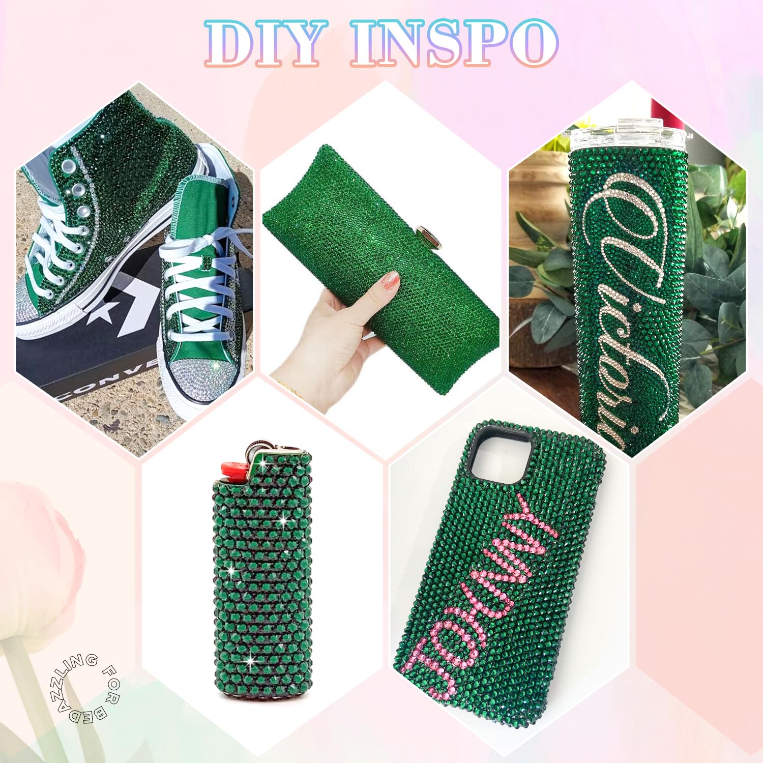 - PACKAGE CONTENT β This all-in-one bedazzler kit includes everything you need to start creating dazzling designs: 1 box of Emerald Green rhinestones with 24 grids (approx. 30,000 pcs of bedazzling rhinestones assorted size SS6/10/16/20/30 ), 1 precision tweezers, 1 pickup pen for handling small gems, and 3 tubes of B7000 jewelry glue for secure application.