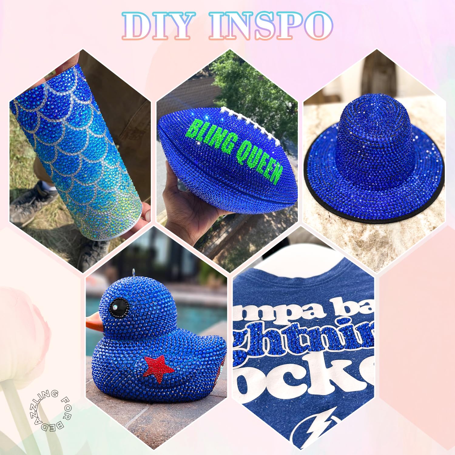 - PACKAGE CONTENT β This all-in-one bedazzler kit includes everything you need to start creating dazzling designs: 1 box of Royal Blue rhinestones with 24 grids (approx. 30,000 pcs of bedazzling rhinestones assorted size SS6/10/16/20/30 ), 1 precision tweezers, 1 pickup pen for handling small gems, and 3 tubes of B7000 jewelry glue for secure application.