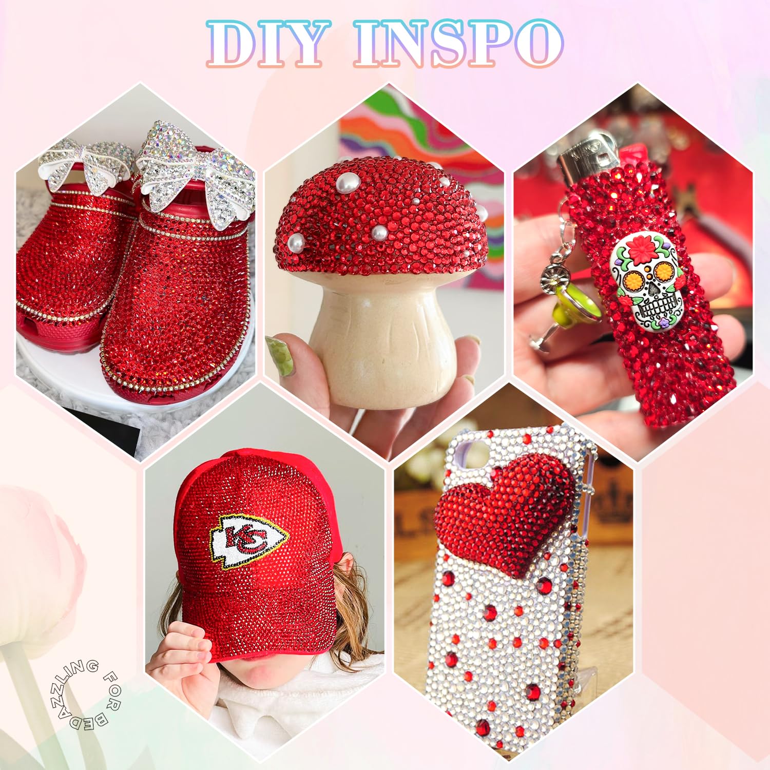 - PACKAGE CONTENT β This all-in-one bedazzler kit includes everything you need to start creating dazzling designs: 1 box of Red rhinestones with 24 grids (approx. 30,000 pcs of bedazzling rhinestones assorted size SS6/10/16/20/30 ), 1 precision tweezers, 1 pickup pen for handling small gems, and 3 tubes of B7000 jewelry glue for secure application.