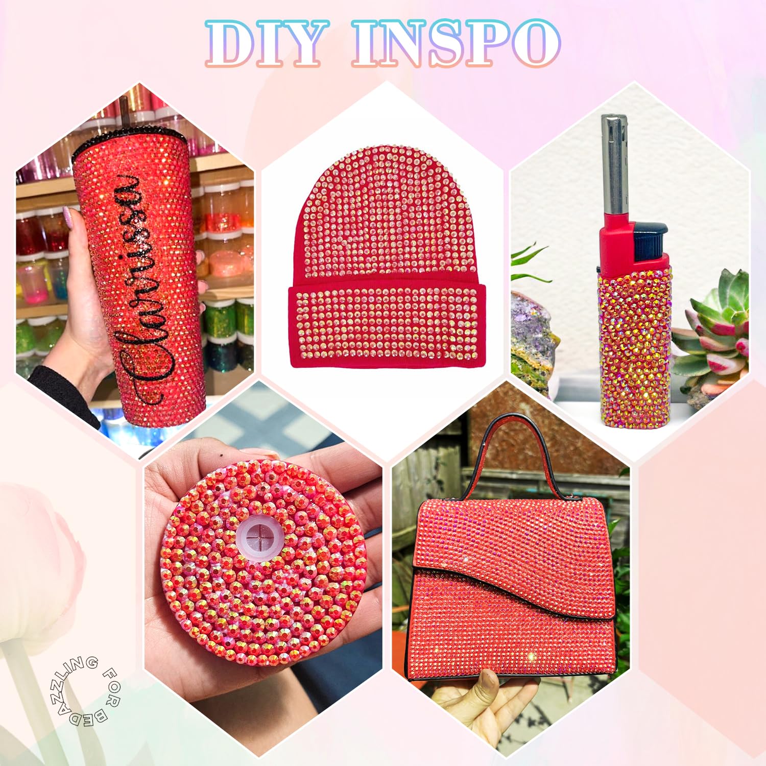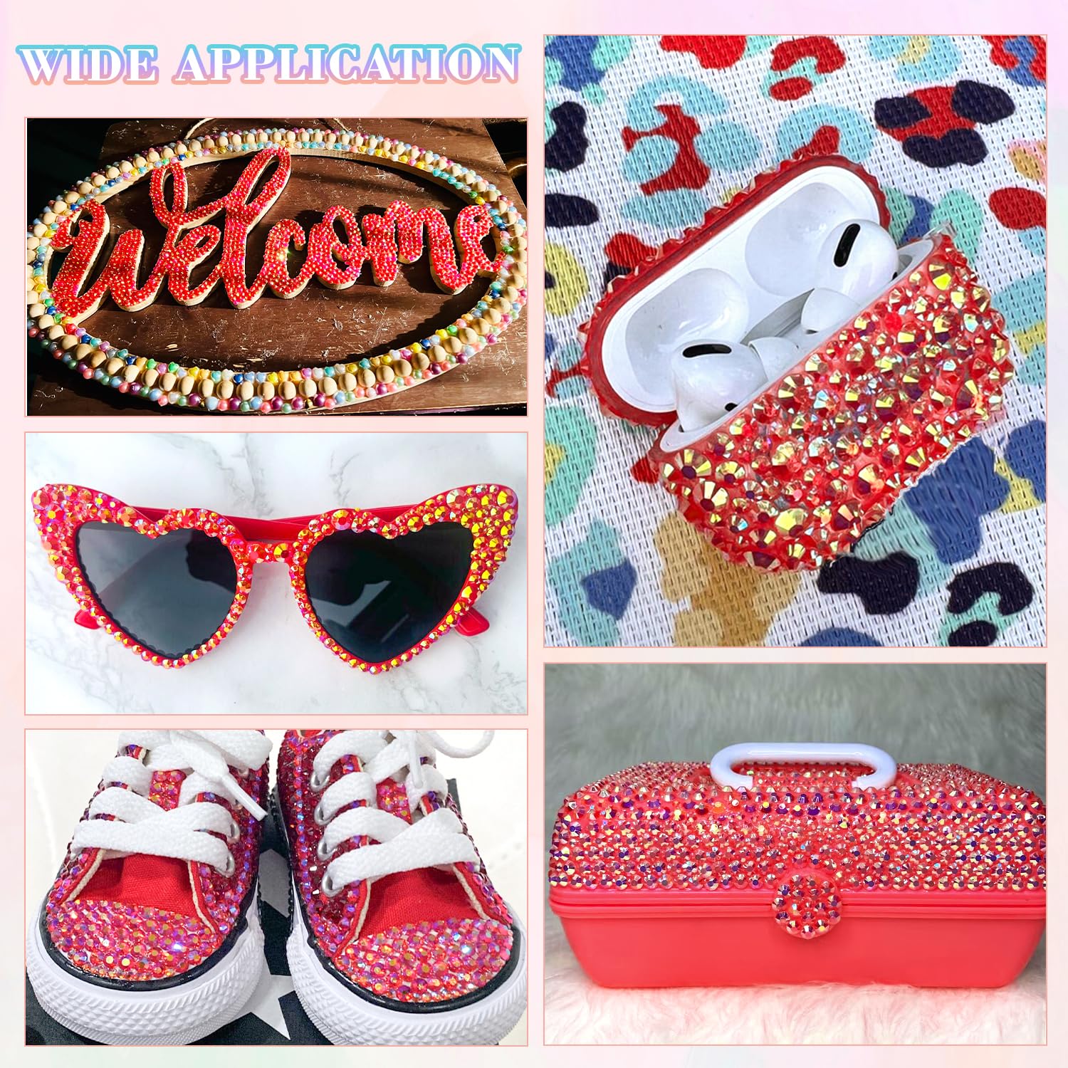- PACKAGE CONTENT β This all-in-one bedazzler kit includes everything you need to start creating dazzling designs: 1 box of Red AB rhinestones with 24 grids (approx. 30,000 pcs of bedazzling rhinestones assorted size SS6/10/16/20/30 ), 1 precision tweezers, 1 pickup pen for handling small gems, and 3 tubes of B7000 jewelry glue for secure application.